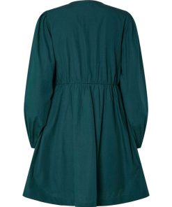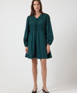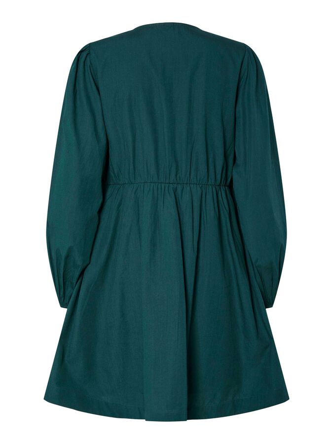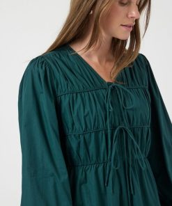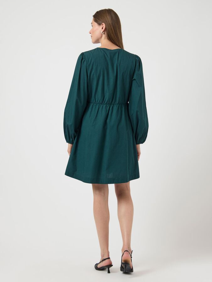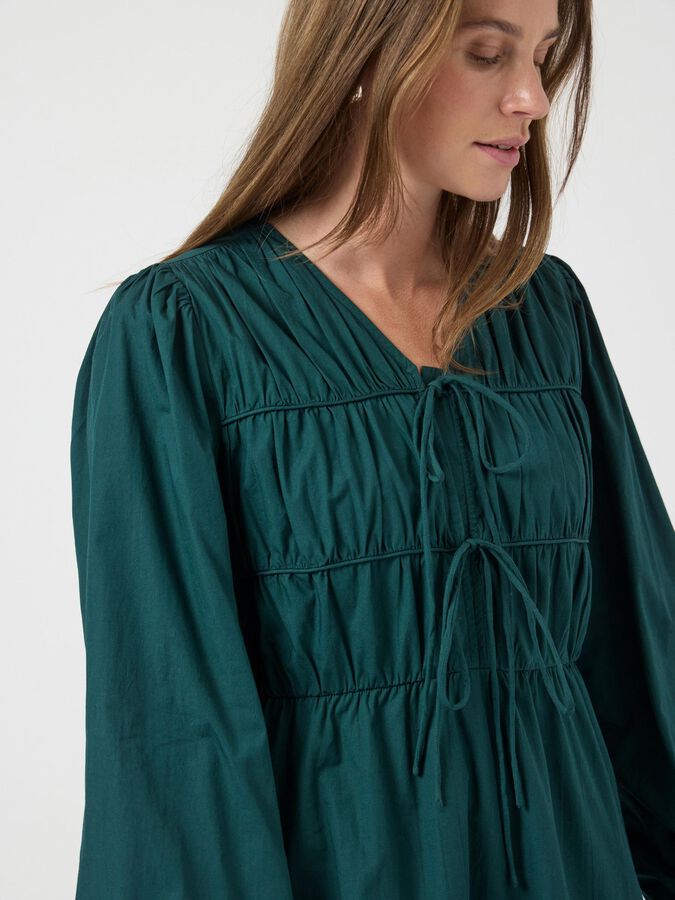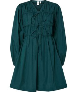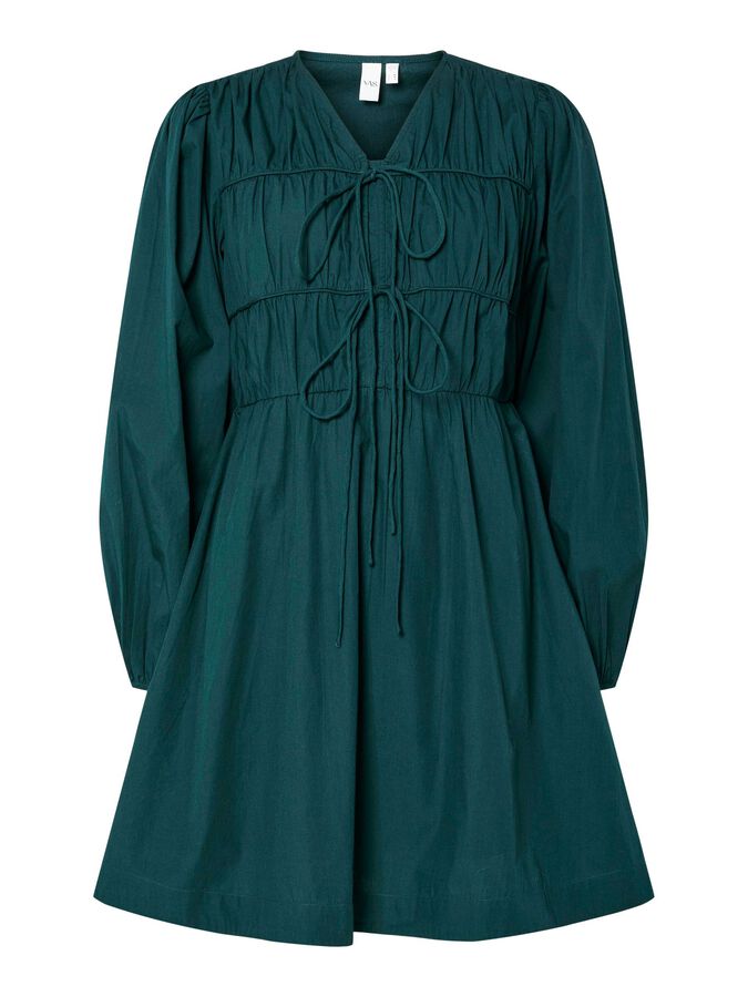 This style is made from a cotton fabric, which is a breathable natural fibre. Product type: Dress Closing : Drawstring fastening Neck : VNeck Sleeve : Long sleeves Sleeves : Balloon sleeves Cuffs : Cuffs with elastic binding Length/Size : Short Extra details: Bow detail Extra details: Cutline at waist Fit : Standard Fit