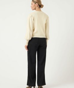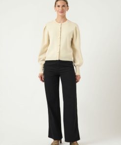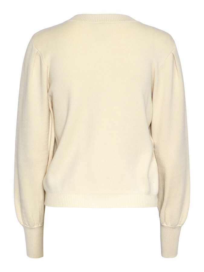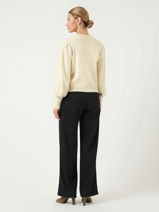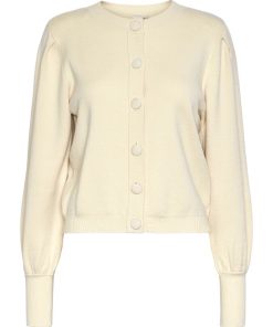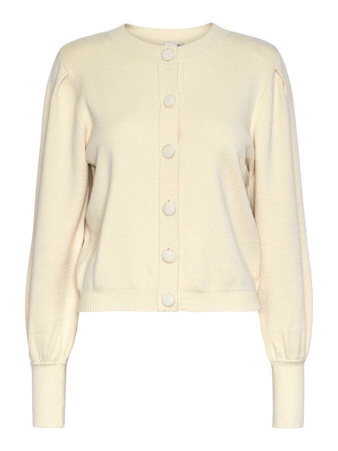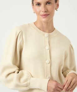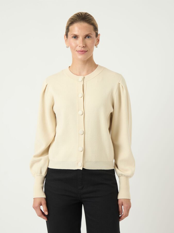 Super soft knitted cardigan Round neck Balloon sleeve with elongated fitted cuffs Buttonup front with covered button detail Small pleat detail at shoulders Cosy fit Model is wearing size M
