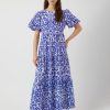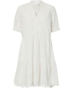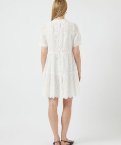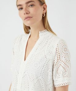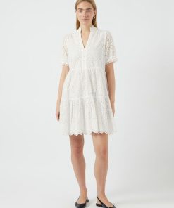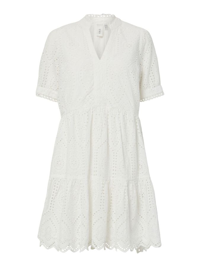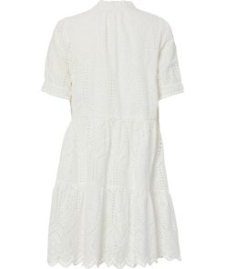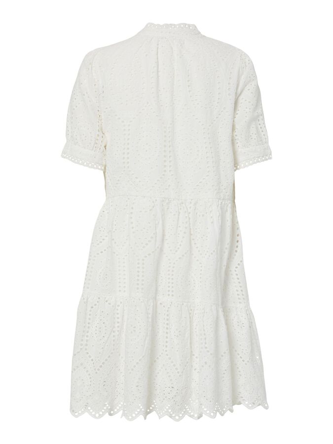 Keyhole vneck Short voluminous sleeves Frilled trim at cuff Tiered skirt Scallop trim hemline Broderie anglaise detail Regular fit