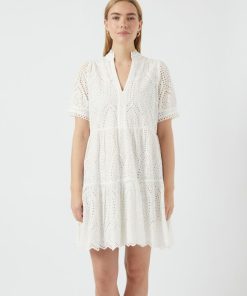 Keyhole vneck Short voluminous sleeves Frilled trim at cuff Tiered skirt Scallop trim hemline Broderie anglaise detail Regular fit