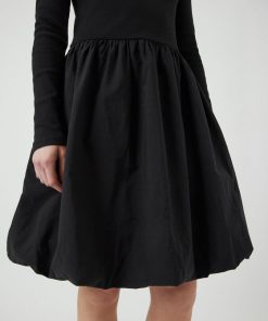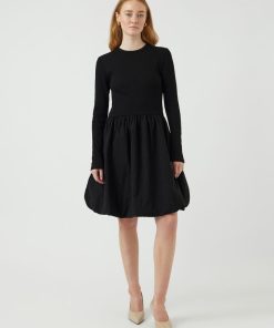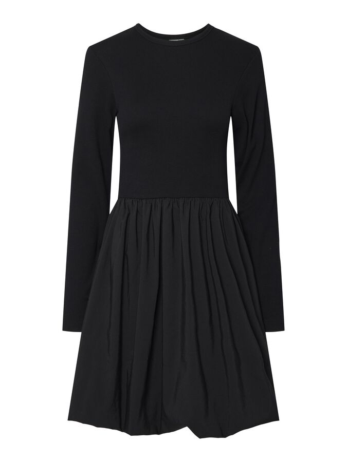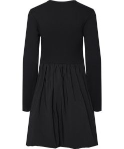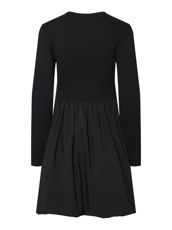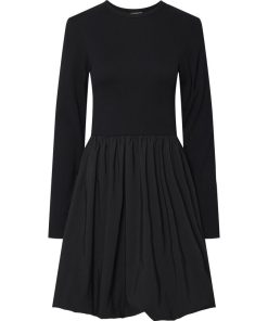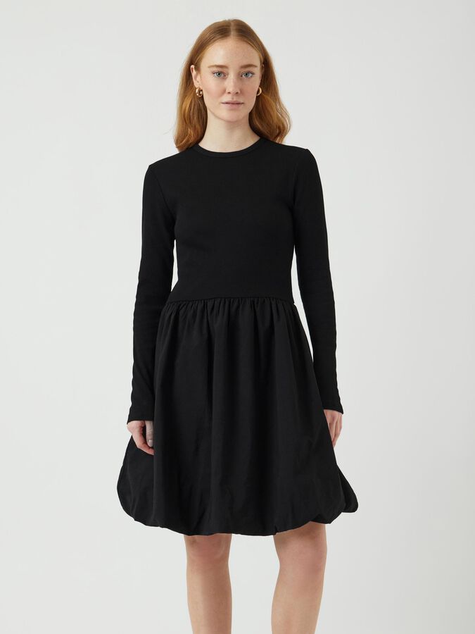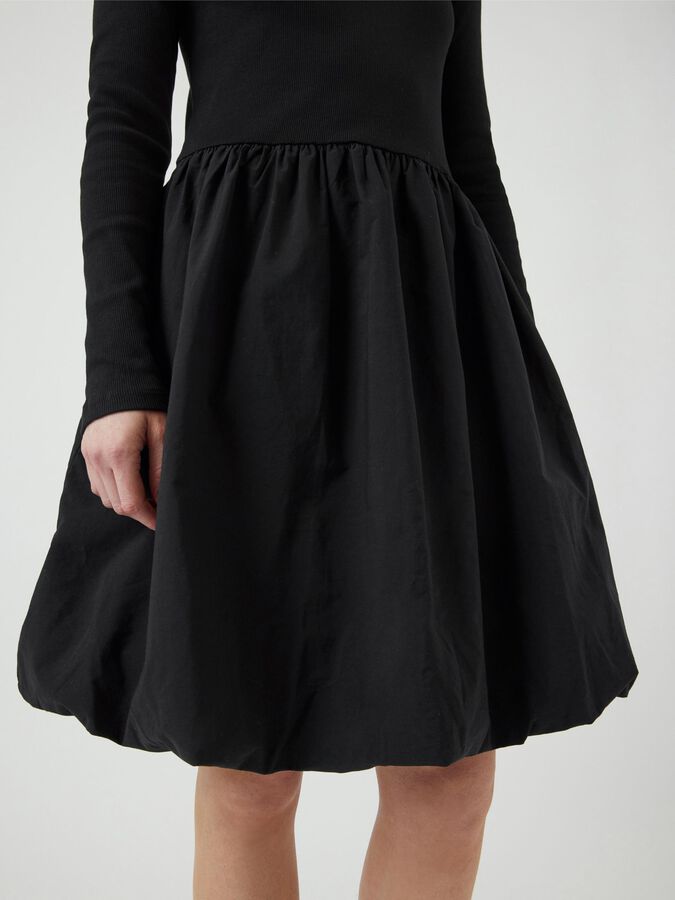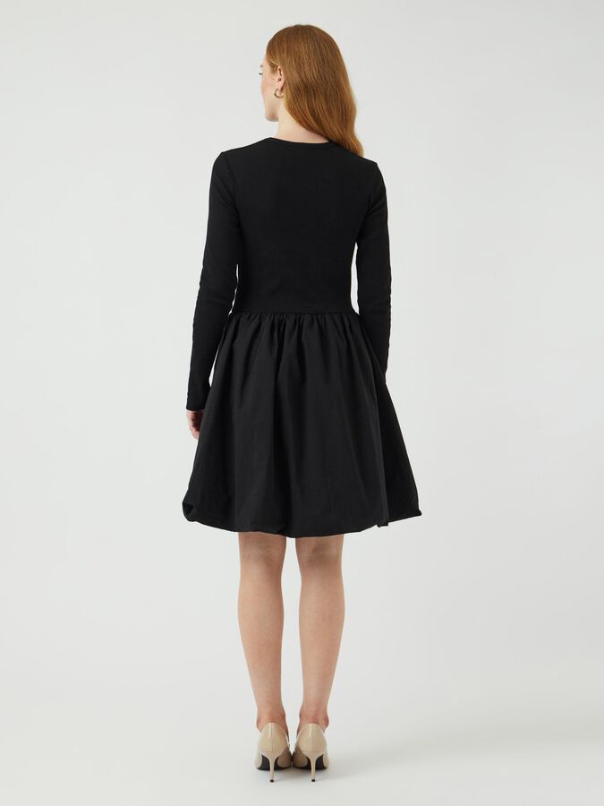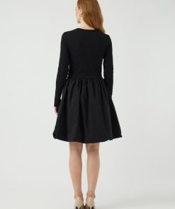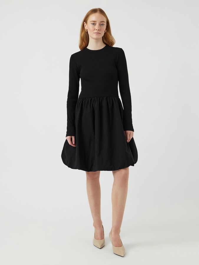 Long sleeved mini dress Round neck Cutline at waist Pleated skirt Regular fit