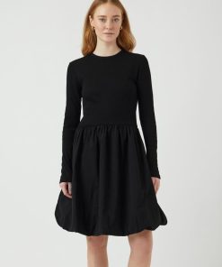 Long sleeved mini dress Round neck Cutline at waist Pleated skirt Regular fit
